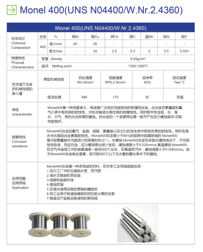 Monel 400 is a nickel-copper alloy (about 67% Ni – 23% Cu) that is resistant to sea water and steam at high temperatures as well as to salt and caustic solutions. Alloy 400 is a solid solution alloy that can only be hardened by cold working. This nickel alloy exhibits characteristics like good corrosion resistance, good weldability and high strength. A low corrosion rate in rapidly flowing brackish or seawater combined with excellent resistance to stress-corrosion cracking in most freshwaters, and its resistance to a variety of corrosive conditions led to its wide use in marine applications and other non-oxidizing chloride solutions. This nickel alloy is particularly resistant to hydrochloric and hydrofluoric acids when they are de-aerated. As would be expected from its high copper content, alloy 400 is rapidly attacked by nitric acid and ammonia systems.