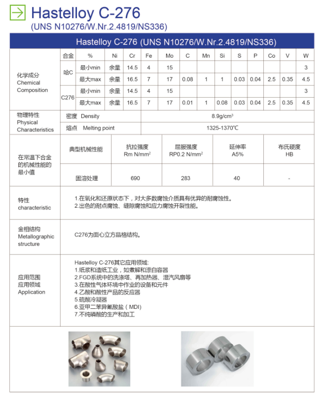 C276 is widely used in the chemical field and petrifaction field, such as the element of chloride organic and catalyze system.This material especially suit for high temperature environment, impure inorganic acid and organic acid (such as formic acid and acetic acid), sea-water corrosion environment.